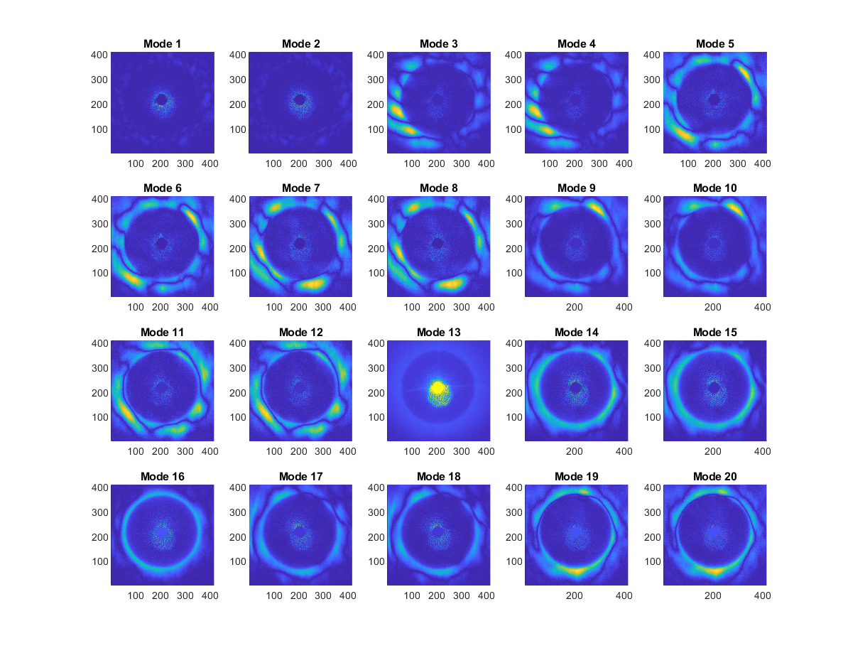 • While the light ring radii are directly proportional to the local film thickness, the intensity of the image areas radially outward from the rings captures the local film thickness gradient, but not the thickness itself. The DMD modes seem to be more sensitive to the changes in the ripples than the rings.